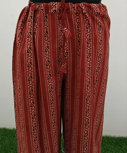 The Cotton Hand Block Ajrakh Printed Narrow Palazzo is a beautiful blend of comfort, style, and traditional craftsmanship. Made from premium-quality cotton fabric, it ensures breathability, softness, and ease of movement, making it ideal for both casual and semi-formal wear. The Ajrakh hand block print adds a touch of cultural heritage with its intricate patterns and deep, earthy tones. The elegant mahroon color enhances its rich and sophisticated look, making it easy to pair with kurtis, tops, or tunics.